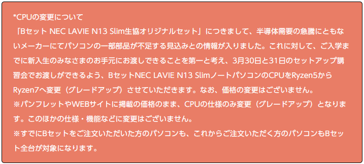 ●Bセット NEC LAVIE N13 Slim生協オリジナルセットのパソコン仕様変更(グレードアップ)について